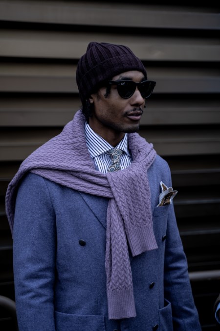 “Pops of colour” were very much in evidence in accessories: from baseball caps, beanies and berets to ties and scarves, offset against more demure colour palettes.